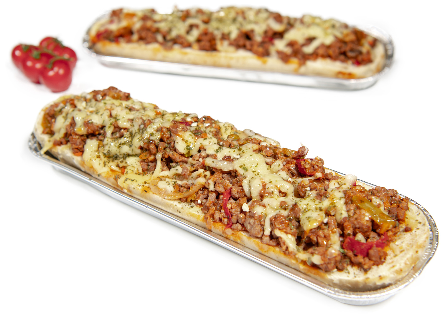 stokbroodje gevuld met gehakt in pizzasaus, afgewerkt met salami, ui , paprika en kaas